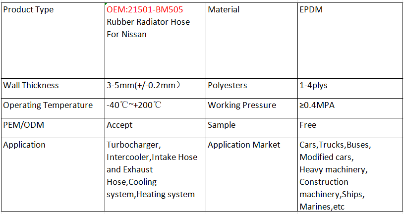EPDM radiator hoses are made of flexible and durable rubber material. They can withstand high temperatures and pressures generated by the engine. These hoses are designed to carry hot coolant from the engine to the radiator and cooler coolant back to the engine. They may also be wrapped with cloth for added protection. Regular inspection is important to detect any signs of wear such as cracks, bulges, or leaks. Damaged hoses must be replaced promptly to prevent coolant leakage and engine damage.
