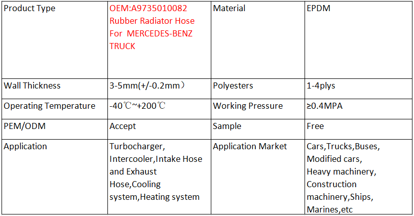 EPDM radiator hoses are made of flexible and durable rubber material. They can withstand high temperatures and pressures generated by the engine. These hoses are designed to carry hot coolant from the engine to the radiator and cooler coolant back to the engine. They may also be wrapped with cloth for added protection. Regular inspection is important to detect any signs of wear such as cracks, bulges, or leaks. Damaged hoses must be replaced promptly to prevent coolant leakage and engine damage.