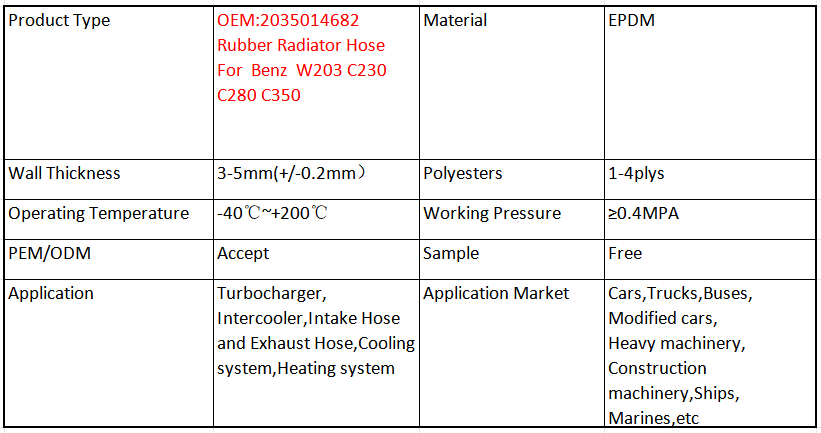 EPDM radiator hoses are made of flexible and durable rubber material. They can withstand high temperatures and pressures generated by the engine. These hoses are designed to carry hot coolant from the engine to the radiator and cooler coolant back to the engine. They may also be wrapped with cloth for added protection. Regular inspection is important to detect any signs of wear such as cracks, bulges, or leaks. Damaged hoses must be replaced promptly to prevent coolant leakage and engine damage.