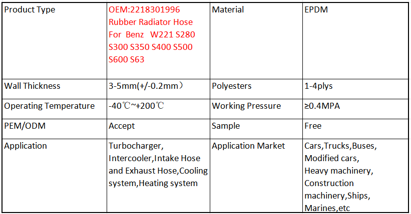 EPDM radiator hoses are made of flexible and durable rubber material. They can withstand high temperatures and pressures generated by the engine. These hoses are designed to carry hot coolant from the engine to the radiator and cooler coolant back to the engine. They may also be wrapped with cloth for added protection. Regular inspection is important to detect any signs of wear such as cracks, bulges, or leaks. Damaged hoses must be replaced promptly to prevent coolant leakage and engine damage.
