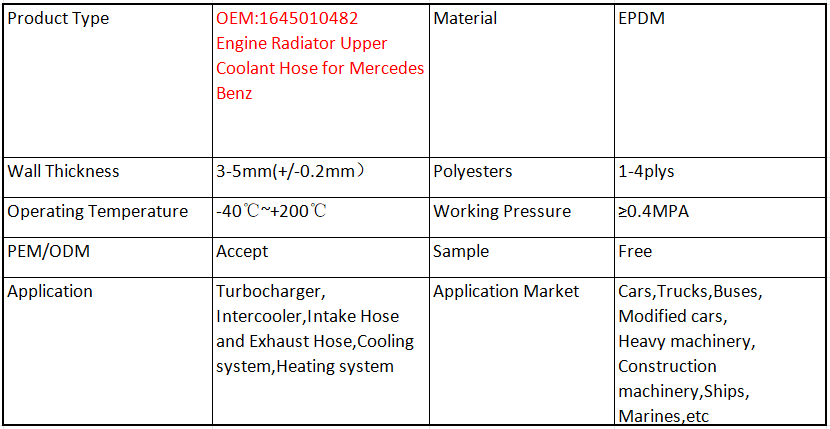EPDM radiator hoses are made of flexible and durable rubber material. They can withstand high temperatures and pressures generated by the engine. These hoses are designed to carry hot coolant from the engine to the radiator and cooler coolant back to the engine. They may also be wrapped with cloth for added protection. Regular inspection is important to detect any signs of wear such as cracks, bulges, or leaks. Damaged hoses must be replaced promptly to prevent coolant leakage and engine damage.